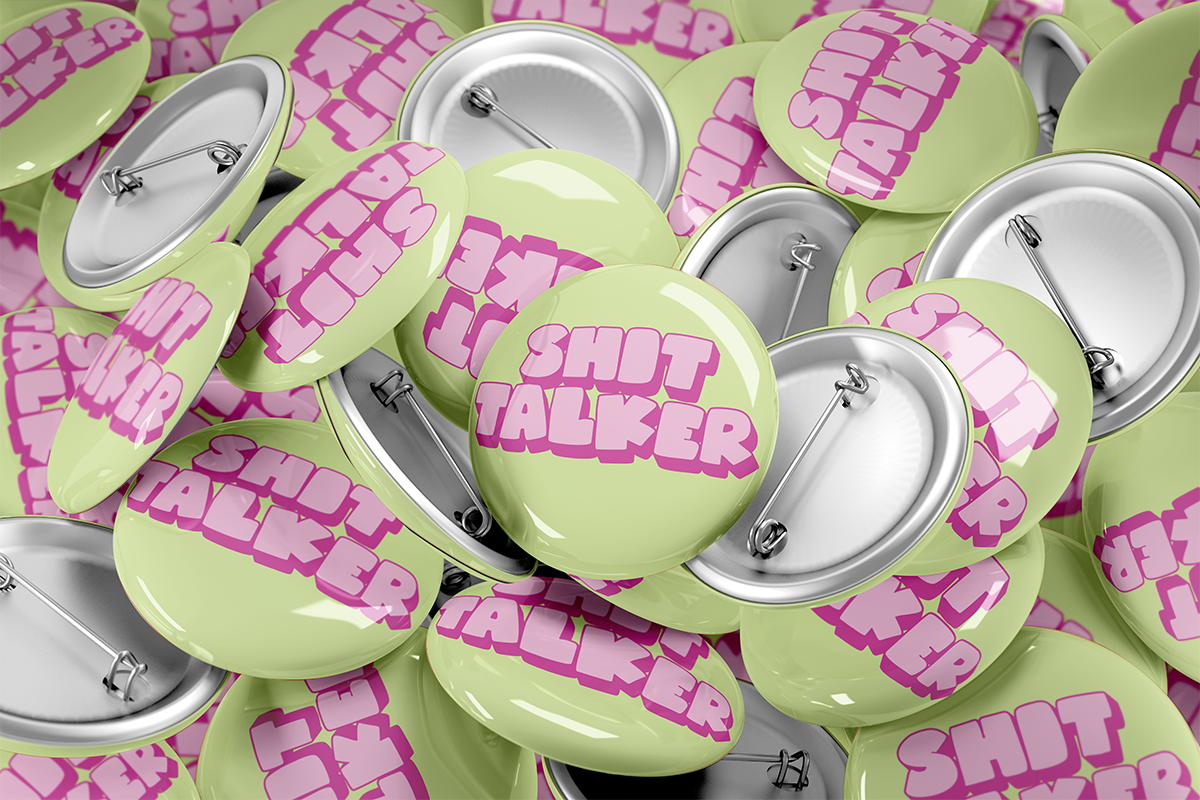 Introducing the "Shit Talker" button pin, the perfect accessory for those who love to talk a little bit of (good-natured) trash!
